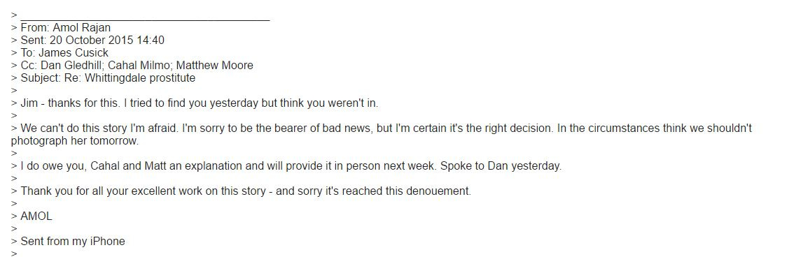 To complete a required legal element of the story before publication, it was important Olivia King be given the opportunity to respond. On October 19 last year “Mistress Kate” was scheduled to work at the London Retreat. Permission was sought from the editor to go the club and speak to her. The same day Amol Rajan was speaking at a Society of Editors conference. John Whittingdale was speaking at the same event just before him.
