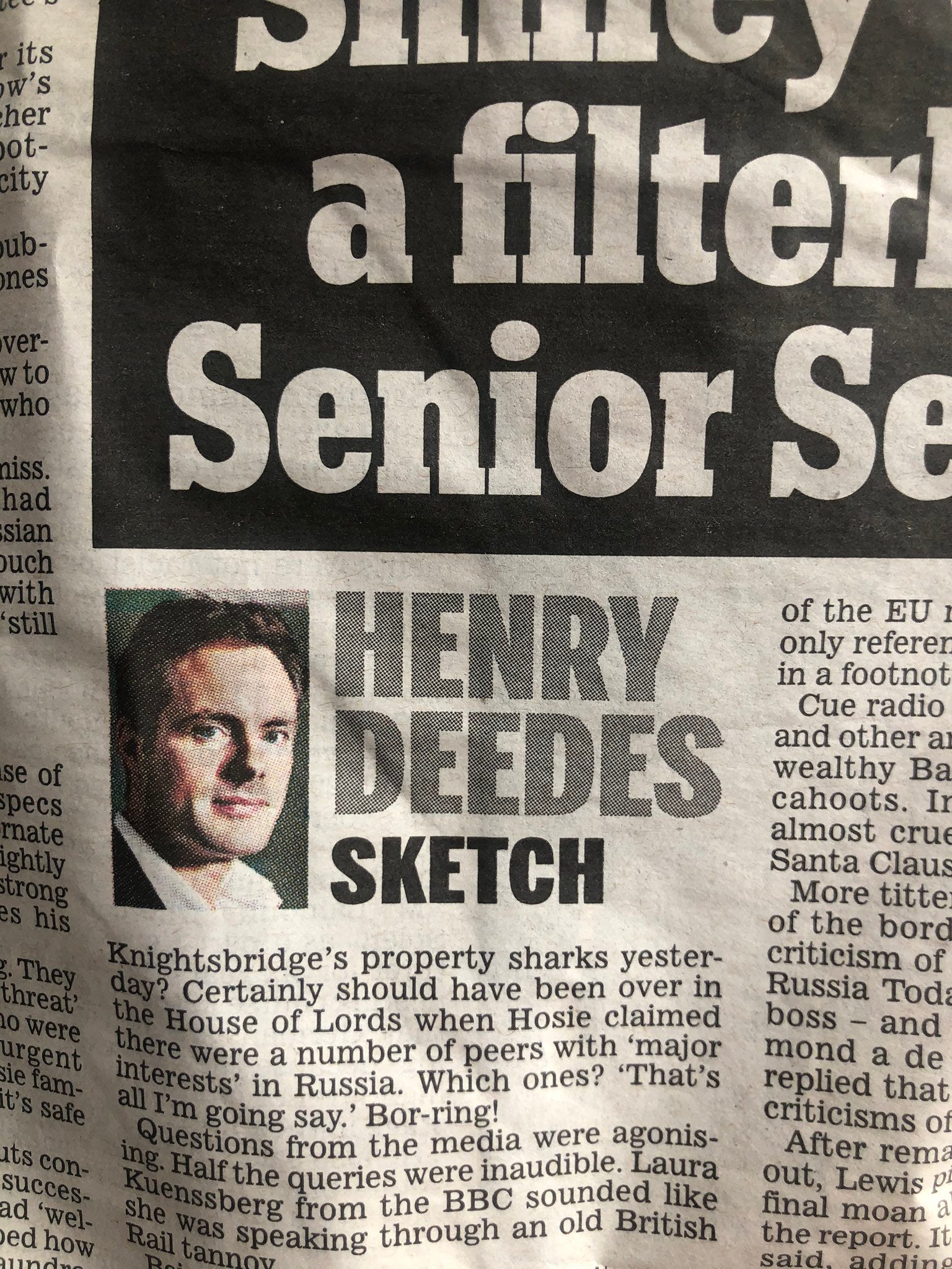 I was punishing myself yesterday by forcing myself to review The Daily Mail. As I flicked through the pages using gloves and a special face shield to avoid any bile splashing from a story and blinding me forever, I noticed a name that jumped out: Henry Deedes. While I’d been aware that Deedes is a Daily Mail columnist, my brain, perhaps out of an abundance of self-preservation by a nervous system already far too used to anger endorphins, I hadn’t made the connection before: