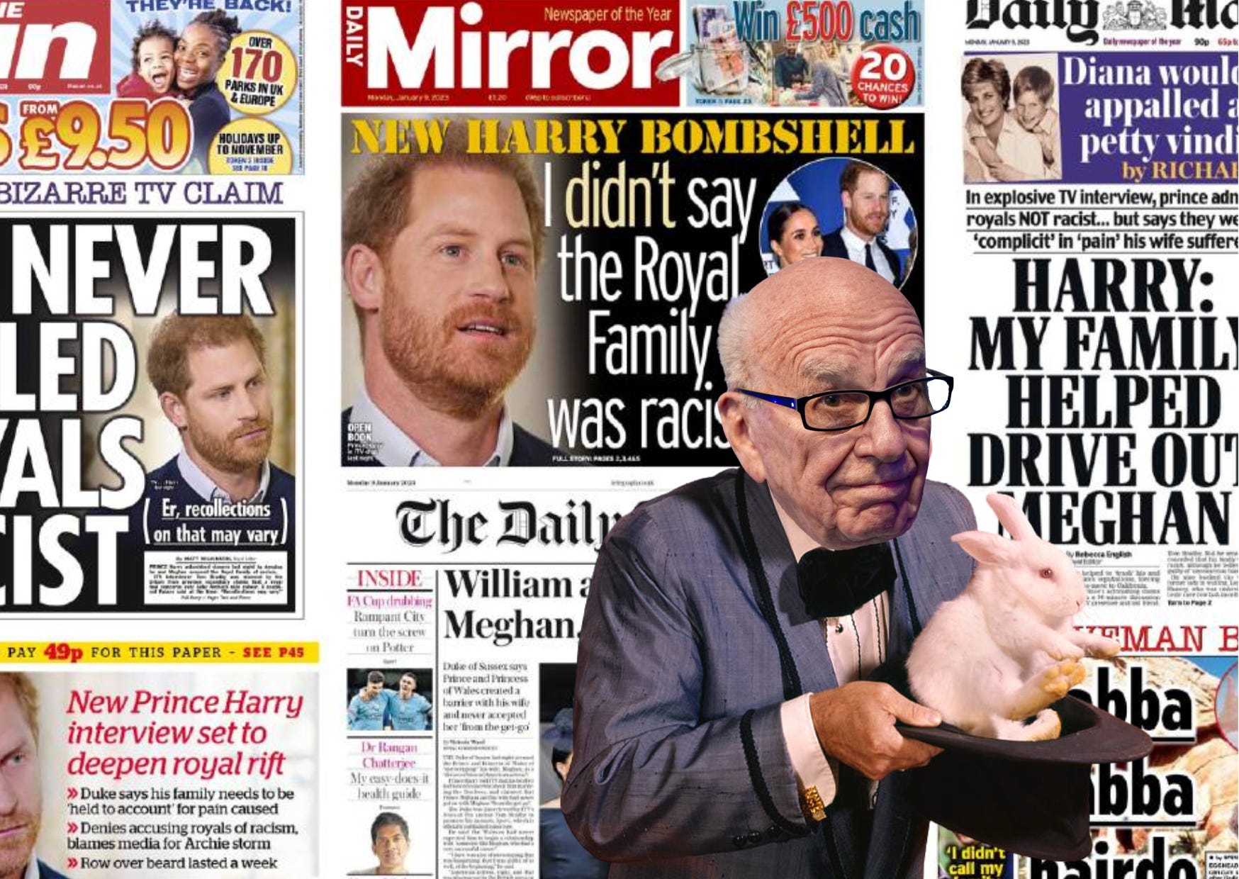 Harry: No. No, no, no. I think it encapsulates all of it. Some of it’s leaking, some of its planting, but I think again what people are starting to understand now is that a royal source is not an unknown person, it is the palace specifically briefing the press, but covering their tracks by being unnamed. And I think that’s pretty shocking to people.That’s another quote that simply will not appear in British newspapers. It would be like the conjurers putting an in-depth explanation of where all those rabbits in the hats come from in their monthly newsletter; Harry is being drummed out of the Magic Circle for showing how the tricks are done.