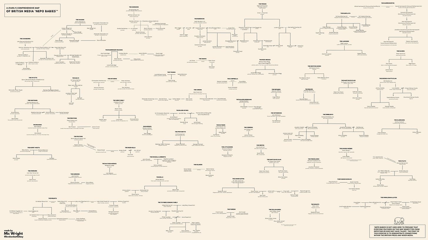 After New York magazine — a product of Comcast (where the hereditary CEO, Brian L. Roberts, is the son of the company’s founder Ralph J. Roberts) — published a series of articles about Hollywood 'nepo babies'1, the British media leapt on the idea. Features and comment pieces considered entertainment, the legal profession, (some) corporate bosses, and politics, but there was the elephant in the room whose stamping and defecating went unacknowledged: The British media itself.