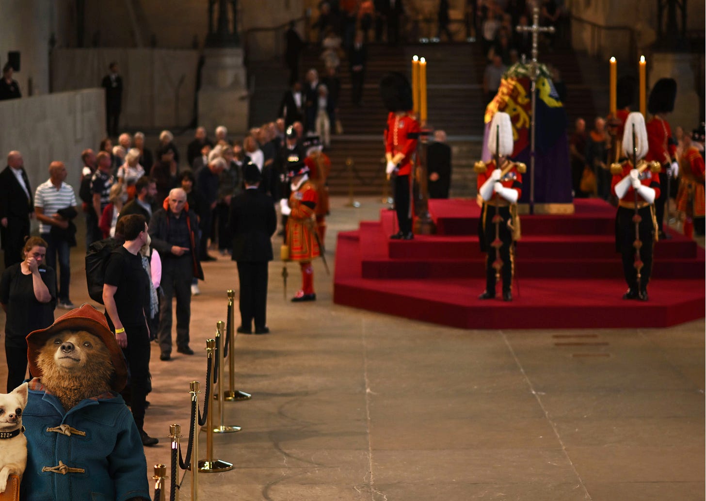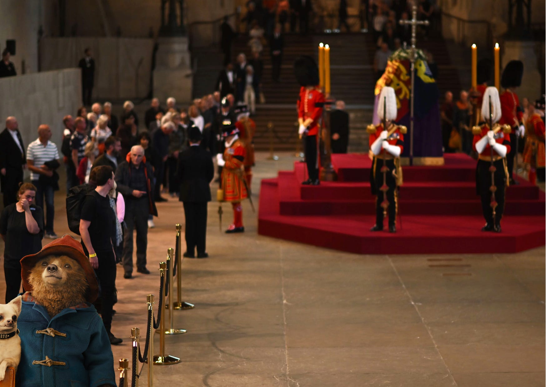 The BBC is live streaming the coffin. As I was writing this sentence, 5287 people were tuned in to see others walk slowly past the Queen lying in state, chivvied as they go by police and security guards. This is where the queue gets you, where hours of waiting are repaid with the chance to glimpse an oak box that was completed 30 years ago, guarded by figures in uniforms stuck in another age entirely.