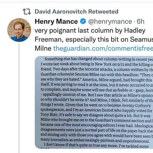 But I saw that article as Milne’s opinion, so why shouldn’t he write it? And Milne, I think, felt similarly of the things I wrote. Given that he went on to become Jeremy Corbyn’s spokesman, and I’m an American Zionist who happily voted for Tony Blair, it’s safe to say we disagree about quite a lot. But it was Milne who brought me on to the Guardian’s comment section and he became one of the most encouraging editors I ever had. Ideological disagreements were just a normal part of life on the paper back then, and mixing only with those you agree with would have been seen by many journalists as embarrassingly partisan and unprofessional.