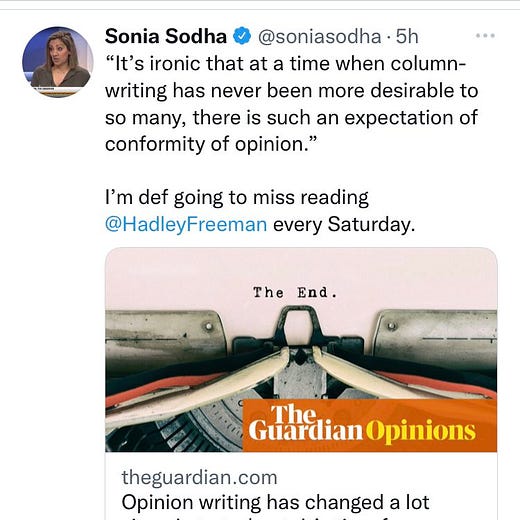 Having once again pretended that the media of 2021 is a uniquely hostile time for national newspaper columnists compared to the collegiate joy of the year 2000, Freeman continues: