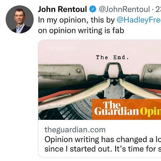 This performative disinterest in writing columns, which implies the 21 years of doing so was a series of embarrassing accidents, is mixed with a kind of Norma Desmondism (“I’m still big, it’s the opinions that have got smaller”).